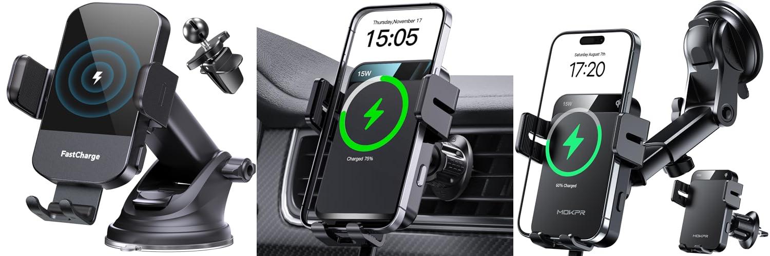 The MOKPR 15W Fast Wireless Car Charger and Phone Mount is a handy gadget for any driver. It keeps your phone charged and easily accessible while you’re on the road. This mount works with many popular phones, including the latest iPhones and Samsung Galaxy models. It’s designed to make your driving experience safer and more convenient by eliminating the need for messy cables.