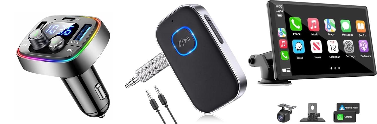 - Multiple audio output options: Bluetooth, built-in speakers, AUX, and FM transmitter connect to your car’s sound system.